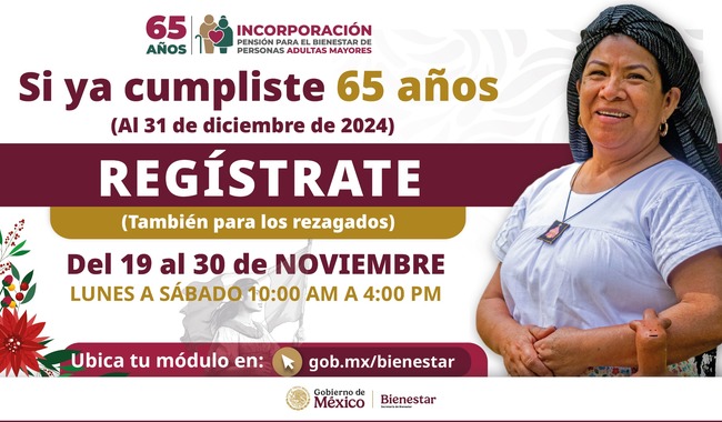 La secretaria Montiel Reyes convocó a las personas Adultas Mayores a acudir a más tardar el 30 de noviembre a cualquier de los Módulos de Bienestar más cercano a su domicilio para realizar su registro que se realiza de lunes a sábado, de 10:00 a 16:00 horas; para ubicar el más cercano es necesario ingresar a la página de la Secretaría de Bienestar: gob.mx/bienestar.