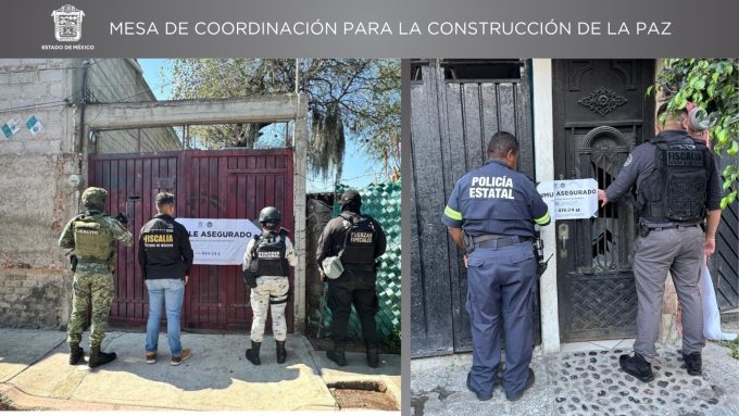 TOLUCA, Estado de México.- El intercambio de información y trabajo de investigación de quienes participan en la Mesa de Coordinación para la Construcción de la Paz, que encabeza por la Gobernadora Delfina Gómez Álvarez, permitió la identificación y aseguramiento de tres inmuebles presuntamente relacionados con actividades delictivas, ubicados en los municipios de Tecámac, La Paz y Nezahualcóyotl.