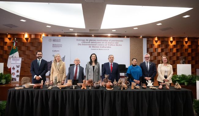 - El Gobierno de México recibió piezas arqueológicas que forman parte del patrimonio cultural mexicano, en el marco del Día Internacional contra el Tráfico Ilícito de Bienes Culturales, establecido por la UNESCO
