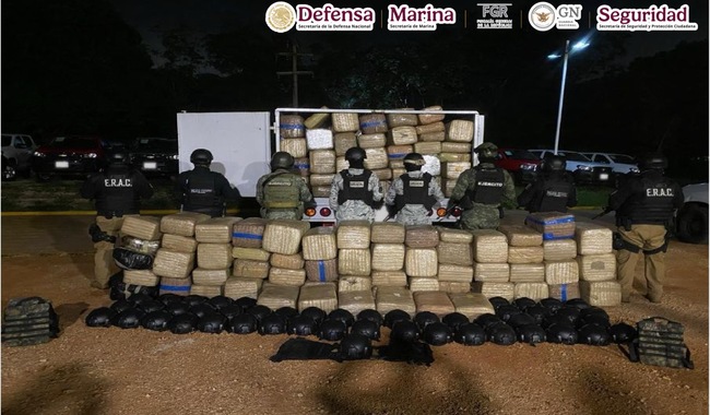 En el marco de la Estrategia Nacional de Seguridad y resultado de las políticas de coordinación implementadas por el Gobierno de México, el Gabinete de Seguridad informa que, en dos acciones diferentes, efectivos de la Secretaría de la Defensa Nacional (Defensa), Secretaría de Marina (Semar), Fiscalía General de la República (FGR), Secretaría de Seguridad y Protección Ciudadana (SSPC), y Guardia Nacional (GN), detuvieron a una persona y aseguraron más de dos toneladas de posible enervante.
