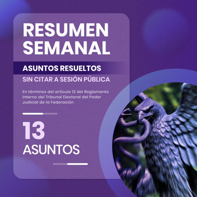 Tribunal Electoral del Poder Judicial de la FederaciónInfografías #ResumenSemanal Del 20 al 23 de enero, el Pleno de la #SalaSuperior del #TEPJF resolvió 13 asuntos sin citar a sesión pública. Por Araceli Bastida - enero 24, 2025 0 FacebookTwitterPinterestLinkedinReddItEmailWhatsAppTelegramVK