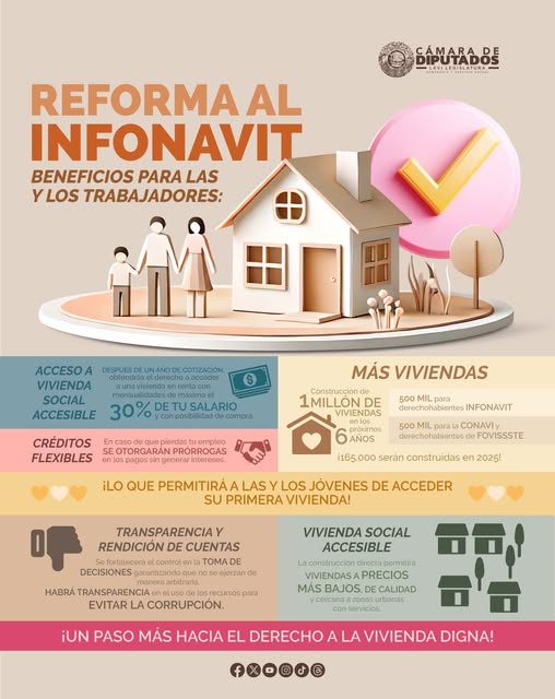¿Sabes en qué consiste la reforma al #INFONAVIT que aprobaron las y los diputados? Con esta medida, se fortalece el acceso a vivienda social accesible, garantizando mejores condiciones para las y los trabajadores.