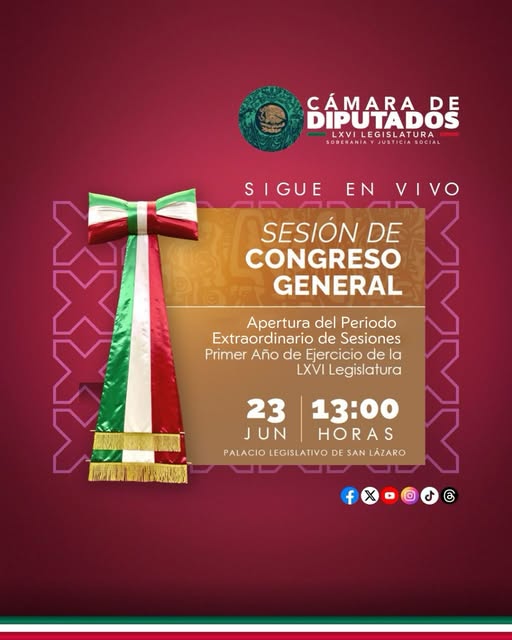 Camara de DiputadosInfografías Sigue en vivo la Sesión de Congreso General para la apertura del Período Extraordinario de Sesiones. Por Araceli Bastida - junio 23, 2025 0 FacebookTwitterPinterestLinkedinReddItEmailWhatsAppTelegramVK