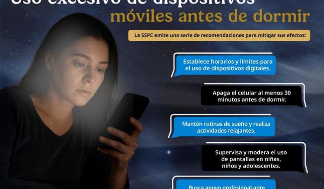 La Secretaría de Seguridad y Protección Ciudadana (SSPC), a través de la Unidad de Inteligencia, Investigación Cibernética y Operaciones Tecnológicas, hace un llamado a la ciudadanía para tomar medidas y evitar la práctica conocida como “vamping”, la cual impacta en la salud física, mental, alteración del sueño, bajo rendimiento escolar o laboral, por el uso excesivo de dispositivos móviles antes de dormir.