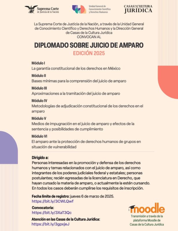 Suprema Corte de Justicia de la NaciónInfografías ¿Te interesa el juicio de amparo? Te invitamos a inscribirte al Diplomado sobre Juicio de Amparo, edición 2025. Por Araceli Bastida - febrero 28, 2025 0 FacebookTwitterPinterestLinkedinReddItEmailWhatsAppTelegramVK