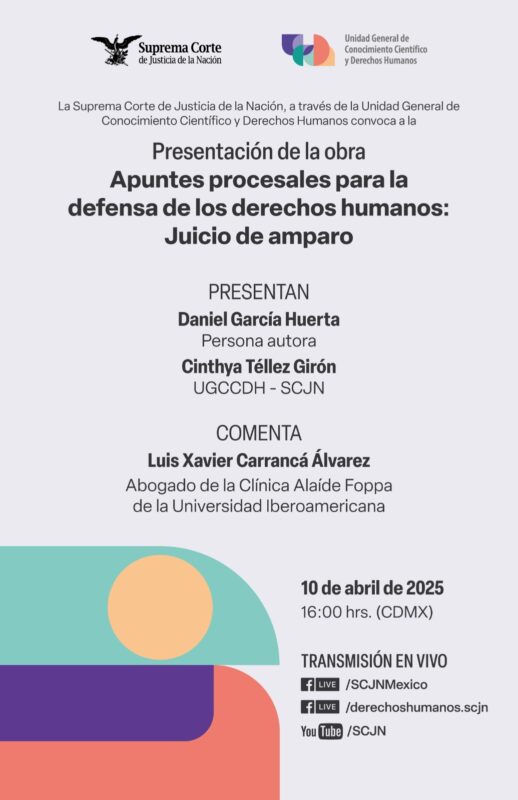 Suprema Corte de Justicia de la NaciónInfografías Te invitamos a la presentación de la obra «Apuntes procesales para la defensa de los derechos humanos: Juicio de amparo”. Por Araceli Bastida - abril 8, 2025 0 FacebookTwitterPinterestLinkedinReddItEmailWhatsAppTelegramVK