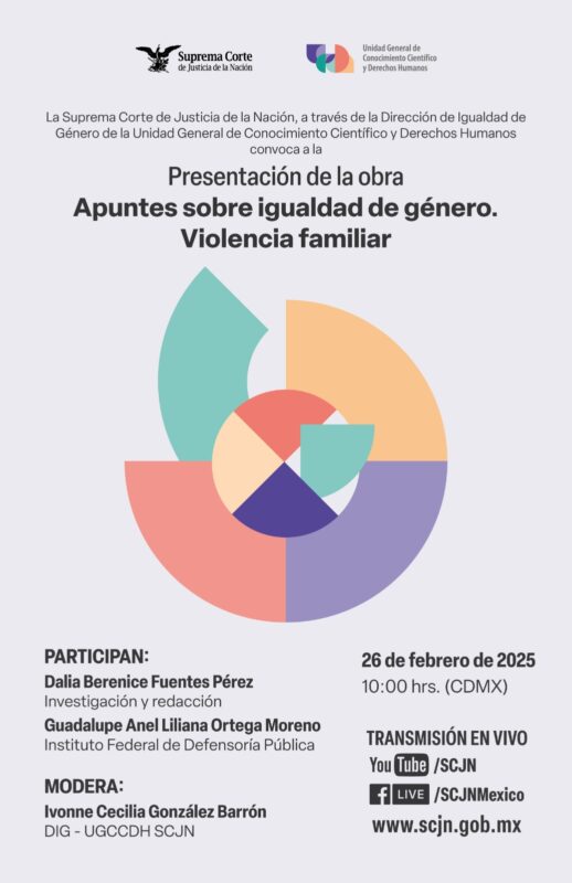 Suprema Corte de Justicia de la NaciónInfografías Te invitamos a seguir MAÑANA la presentación de la obra «Apuntes sobre igualdad de género. Violencia familiar». Por Araceli Bastida - febrero 25, 2025 0 FacebookTwitterPinterestLinkedinReddItEmailWhatsAppTelegramVK