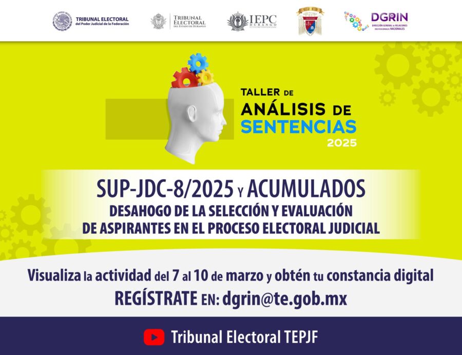 Tribunal Electoral del Poder Judicial de la FederaciónInfografías Te invitamos a ver el Taller de Análisis de Sentencias en la Universidad Juárez del Estado de Durango. Por Araceli Bastida - marzo 10, 2025 0 FacebookTwitterPinterestLinkedinReddItEmailWhatsAppTelegramVK