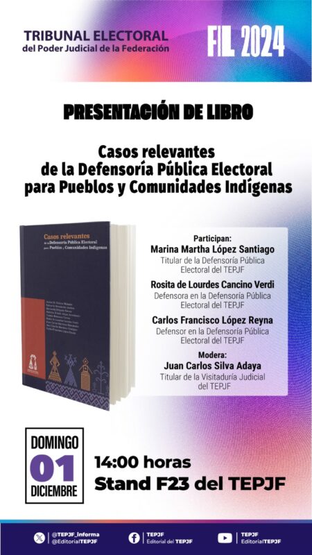 Tribunal Electoral del Poder Judicial de la FederaciónInfografías Te invitamos a ver la presentación del libro: “Casos relevantes de la Defensoría Pública Electoral para Pueblos y Comunidades Indígenas”, en el marco de la #FILGuadalajara. Por Araceli Bastida - diciembre 1, 2024 0 FacebookTwitterPinterestLinkedinReddItEmailWhatsAppTelegramVK