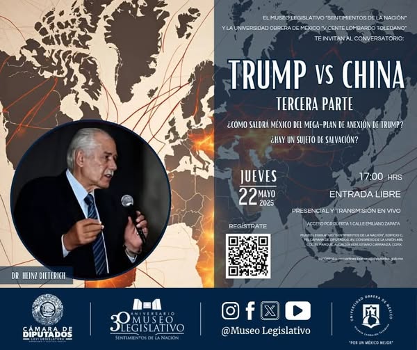 Camara de DiputadosInfografías Te invitamos al conversatorio: Trump vs. China. ¿Cómo saldrá México del mega-plan de anexión de Trump? ¿Hay un sujeto de salvación? Por Araceli Bastida - mayo 22, 2025 0 FacebookTwitterPinterestLinkedinReddItEmailWhatsAppTelegramVK