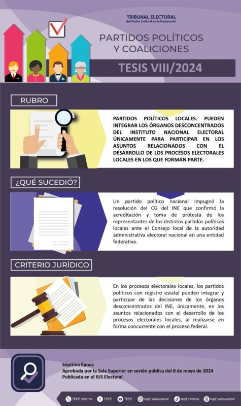 Tesis VIII/2024 Rubro: Partidos políticos locales. Pueden integrar los órganos desconcentrados del Instituto Nacional Electoral únicamente para participar en los asuntos relacionados con el desarrollo de los procesos electorales locales en los que forman parte.