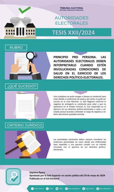 Inicio Tribunal Electoral del Poder Judicial de la Federación Infografías Tesis XXII/2024 Rubro: Principio pro persona. Las autoridades electorales deben interpretarlo cuando...