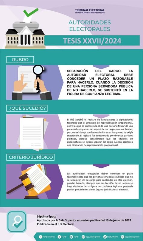 Inicio Tribunal Electoral del Poder Judicial de la Federación Infografías Tesis XXVII/2024 Rubro: Separación del cargo. La autoridad electoral debe conceder un...