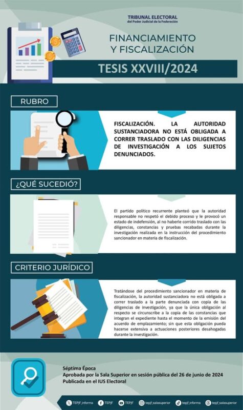 Tribunal Electoral del Poder Judicial de la FederaciónInfografías Tesis XXVIII/2024 Rubro: Fiscalización. La autoridad sustanciadora no está obligada a correr traslado con las diligencias de investigación a los sujetos denunciados. Por Araceli Bastida - julio 30, 2025 0 FacebookTwitterPinterestLinkedinReddItEmailWhatsAppTelegramVK