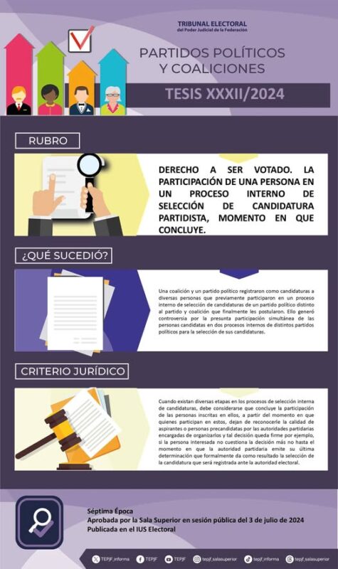 Tribunal Electoral del Poder Judicial de la FederaciónInfografías Tesis XXXII/2024 Rubro: Derecho a ser votado. La participación de una persona en un proceso interno de selección de candidatura partidista, momento en que concluye. Por Araceli Bastida - agosto 11, 2025 0 FacebookTwitterPinterestLinkedinReddItEmailWhatsAppTelegramVK