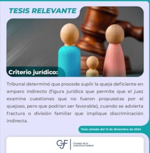 #TesisRelevante | Al juzgar con #PerspectivaDeGénero, un Tribunal determinó que procede suplir la queja en amparo indirecto cuando se advierta fractura o división familiar que implique discriminación indirecta.