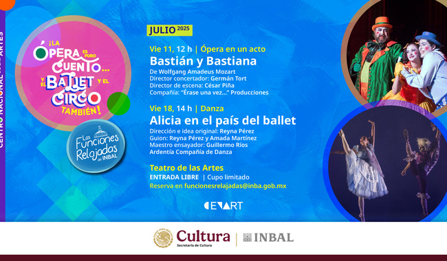En las “Funciones relajadas”, el púbico tiene la libertad de salir y regresar a sala, moverse, hacer sonidos y manifestar estados de ánimo libremente, además de contar con un espacio adaptado con música ambiental para que pueda descansar antes y después de la función, así como con un sensorama para que las personas puedan manipular objetos y realizar actividades que le ayuden a relajarse. En esta ocasión, se presentarán como “Funciones relajadas” en el Teatro de las Artes la ópera Bastián y Bastiana, el viernes 11 de julio a las 12:00 h, y Alicia en el país del ballet, el viernes 18 de julio a las 14:00 h, con entrada libre. Estas funciones tendrán un aforo para 250 personas.