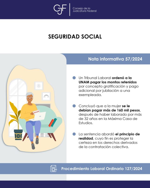 Consejo de la Judicatura FederalInfografías Tribunal Laboral garantiza el derecho a la jubilación a exempleada de la UNAM Por Araceli Bastida - diciembre 15, 2024 0 FacebookTwitterPinterestLinkedinReddItEmailWhatsAppTelegramVK