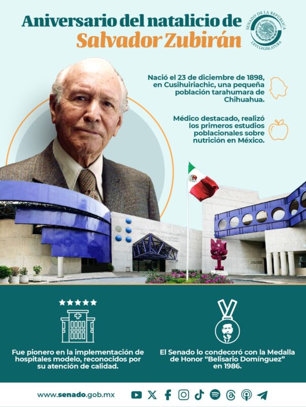 Senado de la RepublicaInfografías Un día como hoy nació Salvador Zubirán, médico mexicano que luchó contra la desnutrición en nuestro país, y fue un gran impulsor de la modernización de la medicina. Por Araceli Bastida - diciembre 23, 2024 0 FacebookTwitterPinterestLinkedinReddItEmailWhatsAppTelegramVK