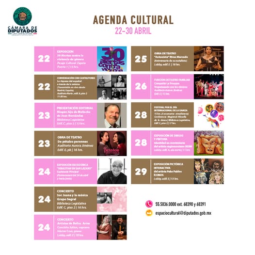 Vive la cultura en San Lázaro. Del 22 al 30 de abril, teatro, exposiciones, música y más en la Agenda Cultural de la Cámara de Diputados, organizada por el Espacio Cultural San Lázaro.